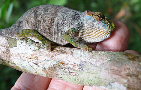 El investigador sorprendió a una serpiente comiéndose uno. El camaleón, que acababa de ser vomitado por la serpiente, estaba muerto. Sin embargo, poco después Marshall se topó con otro ejemplar, que sí estaba vivo y pudo fotografiarlo.