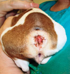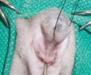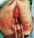 Foto 4 A: Jack Russell Terrier de 8 semanas de edad con ano imperforado y FRV. Una pinza mosquito fácilmente comunica con el lumen rectal, y la punta hacia el exterior desvía la membrana anal.