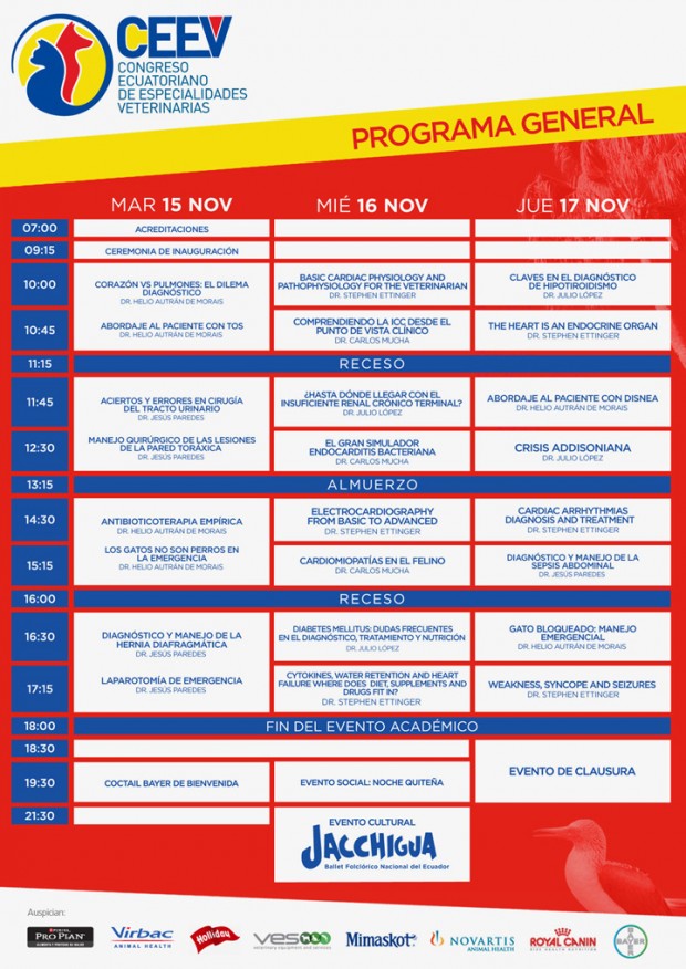 AMVEPE (Asociaciòn de Mèdicos Veterinarios Especialistas en Pequeñas Especies), AEMFE (Asociaciòn Ecuatoriana de Medicina Felina), ECVECCS (Sociedad Ecuatoriana de Emergencias y Cuidados Crìticos Veterinarios), SOTVEC (Sociedad de Ortopedistas y Traumatòlogos Veterinarios del Ecuador) y USFQ (Universidad San Francisco de Quito) se unen para llevar a cabo uno de los eventos de mayor importancia no solo para el país sino para latinoamérica, «demostrando un claro ejemplo de hermandad, con un profundo deseo de llevar al Ecuador a altos sitiales de la Veterinaria desde el punto de vista, científico, ético y profesional».