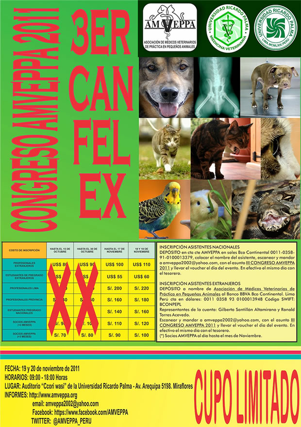 Evento organizado por la AMVEPPA, Asociación de Médicos Veterinarios de Práctica en Pequeños Animales del Perú: Miembro de la FIAVAC y WSAVA (Federación Iberoamericana de Asociaciones Veterinarias de Animales de Compañía & World Small Animal Veterinary Association, respectivamente.) con el patrocinio de la Universidad Ricardo Palma – Escuela de medicina Veterinaria.