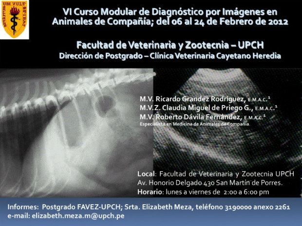 La Facultad de Medicina Veterinaria y Zootecnia a través de su dirección de Postgrado presentan el Sexto Curso Modular de Extensión Diagnóstico por Imágenes en Animales de Compañía del 06 al 24 de Febrero del 2012.