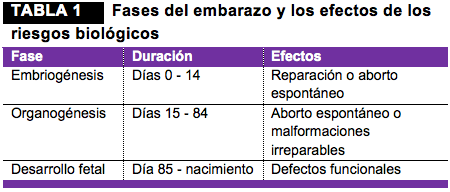 Las tres fases del embarazo son la embriogénesis, la organogénesis y el desarrollo fetal (TABLA 1). La exposición al riesgo biológico en cada fase tiene diferentes efectos sobre el feto. La embriogénesis comienza en la fertilización del óvulo y dura aproximadamente 2 semanas. El daño celular durante esta fase ya sea se repara, lo que permite continuar el crecimiento, o resulta en la muerte del feto. Durante la organogénesis, empieza la formación del tejido conjuntivo, órganos y otros sistemas corporales del feto. La organogénesis dura desde el día 15 hasta el día 84 de gestación. El daño al feto durante esta fase resulta en muerte fetal o en malformaciones irreparables. Durante la fase final, es decir el desarrollo fetal (desde el día 85 hasta el nacimiento), el daño al feto origina defectos funcionales en lugar de defectos estructurales: en vez de malformación física visible del feto, los efectos principales son retraso mental y de crecimiento, así como el acortamiento del tiempo de gestación.