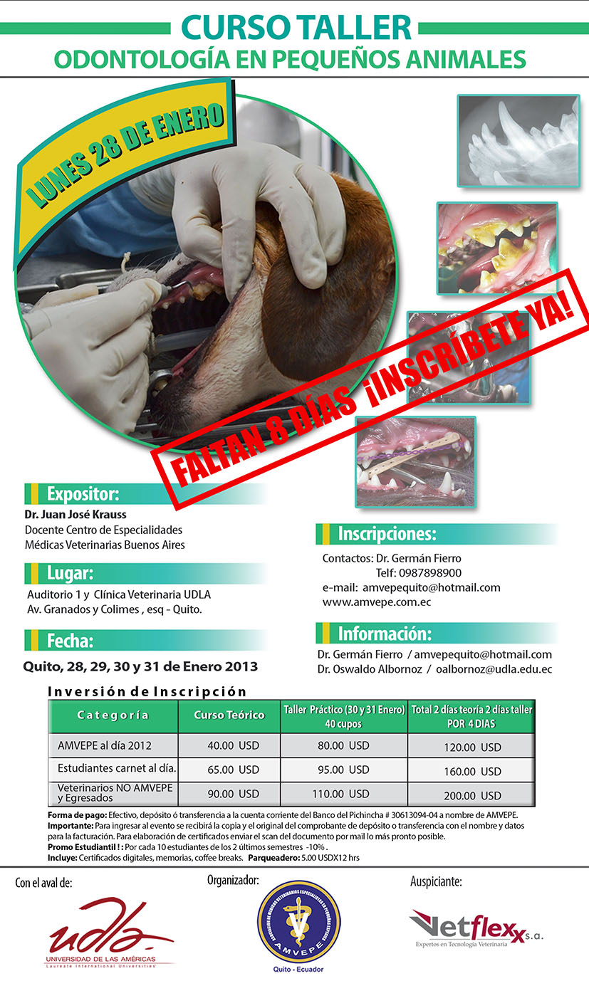 La Asociación de Médicos Veterinarios Especialistas en Pequeñas Especies organiza el Curso Taller – Odontología en Pequeños Animales contando como expositor al Dr. Juan José Krauss Docente del Centro de Especialidades Médico Veterinarias de Buenos Aires.