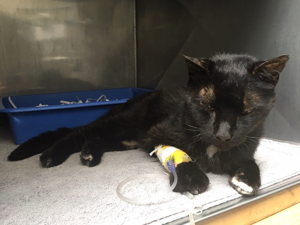 La gatita se presenta muy deprimida, con membranas mucosas pálidas, bradicardia a 130 latidos por minuto, auscultación normal. Hay hipersalivación, con olor a urea en la boca y la saliva parece mezclada con sangre endeshidratada algunas zonas, donde hay posibles úlceras. Delgada, su condición corporal es de 3 sobre 9, y está muy deshidratada.