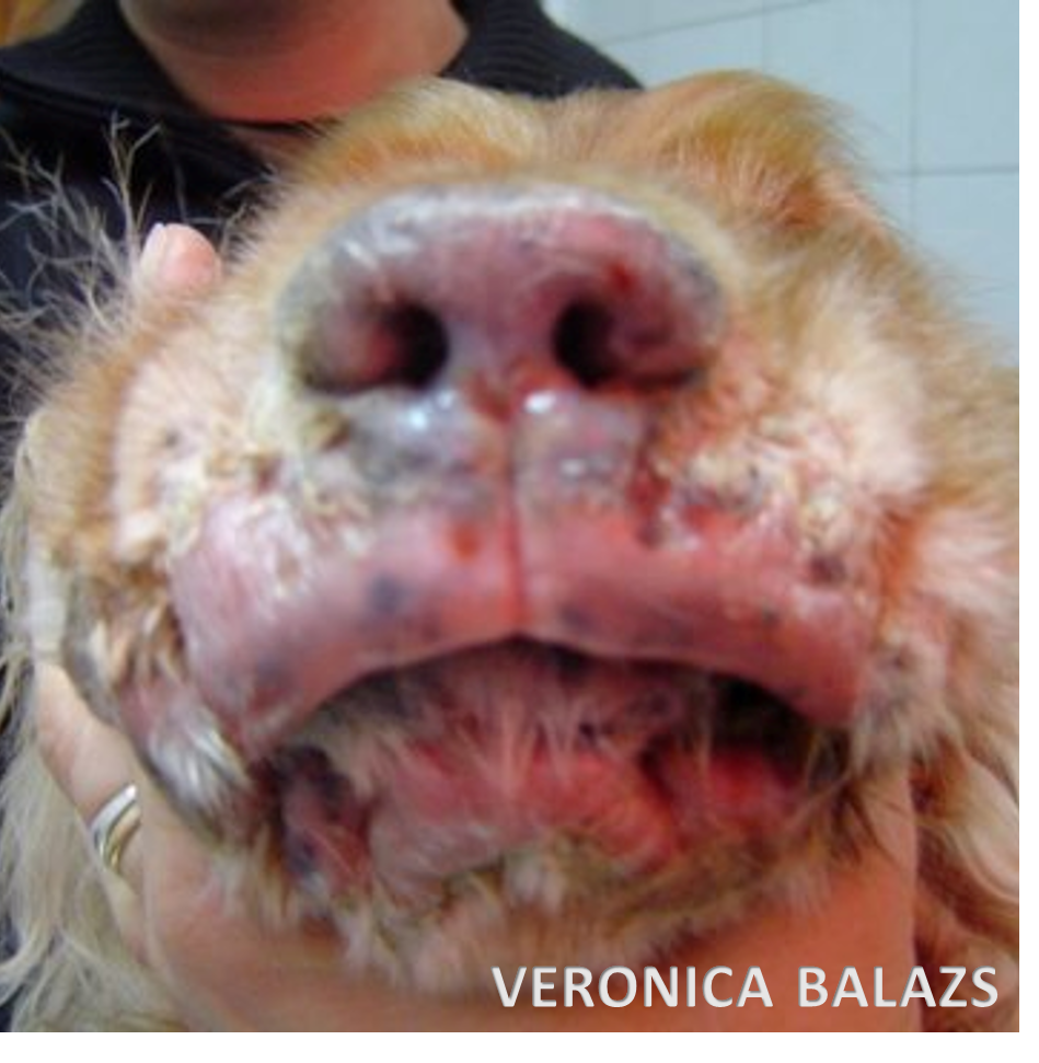 • En el examen dermatológico se observó un eritema difuso de la piel con algunas zonas ulcerativas y excesiva descamación. Además se apreció despigmentación del plano nasal y labios y ulceraciones en la mucosa oral.