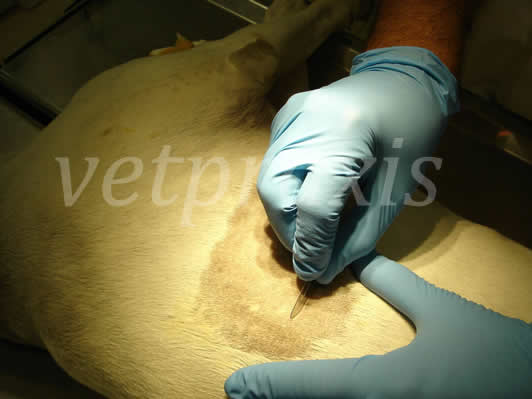 Se le comenta al propietario que es necesario iniciar la aproximación diagnóstica con un estudio citológico. Se procede a limpiar la herida con una gasa embebida en solución de clorhexidina al 2% para desinfectar la zona de PAF y remover las costras supurativas. Este procedimiento crea mucha incomodidad en el paciente que expresa vocalizaciones y se rehúsa al procedimiento.