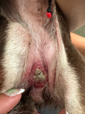 Llega a consulta un paciente canino, chihuahua hembra entera de 12 años con una masa de 3 cm (FOTO 1.0) sobre la piel del vientre en la porción inguinal central. La masa se observa irregular no pigmentada, ulcerada de superficie necrótica supurativa, con apariencia intradérmica, de bordes eritematosos y emana un olor desagradable relacionado con contaminación bacteriana. El propietario manifiesta que la masa la percibieron de casualidad hace algunos meses pero en las últimas dos semanas creció a velocidad aumentada.