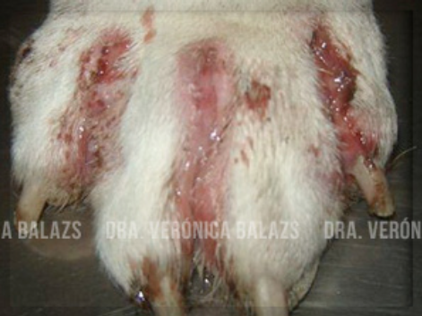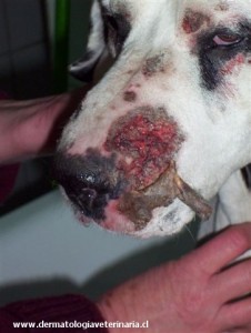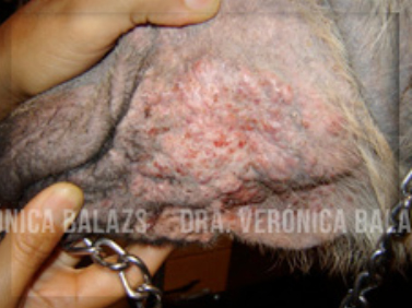 Una dálmata de 5 años es remitida para una segunda opinión debido a un año de evolución de una infección cutánea ulcerativa. Sin antecedentes de viajes a áreas endémicas de S. brasiliensis ni contacto con gatos infectados. Tratada previamente con prednisona y antibióticos, sin mejoría significativa."