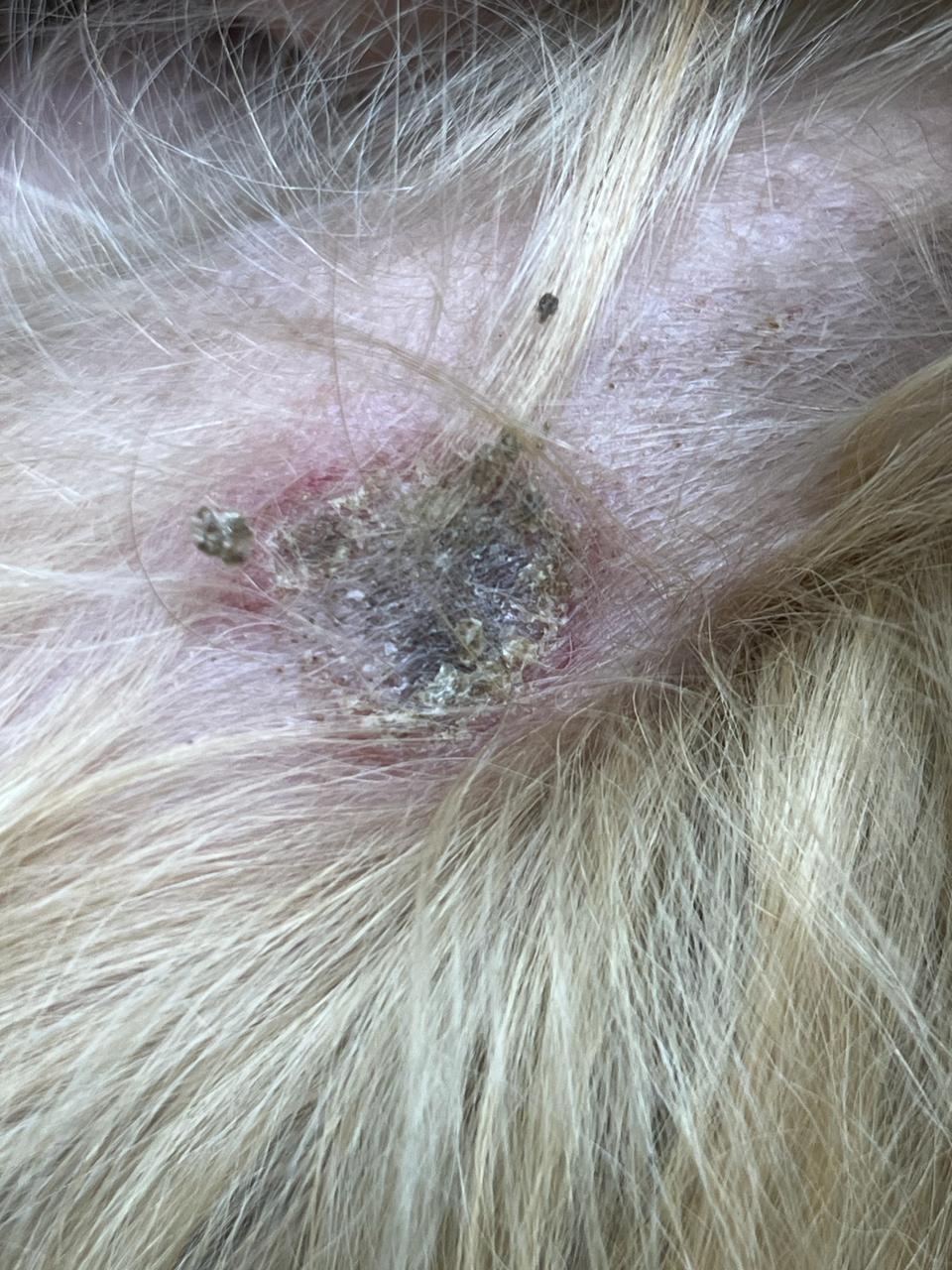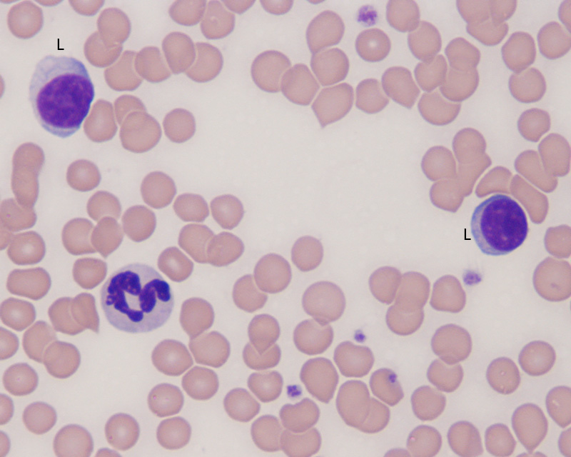 Su tutor no reporta cambios en su estado de ánimo, apetito o signos de enfermedad. En el hemograma se observó: hematocrito 35%, hemoglobina 12.5 g/dL, recuento de glóbulos rojos 7.2 mill/uL, proteínas totales 7.2 g/dL, plaquetas 110,000/µL, recuento de glóbulos blancos 18,600/uL (neutrófilos 8,000/uL, linfocitos 10,000/uL, eosinófilos 300/uL, monocitos 300/uL). El test rápido para leucemia y sida fue negativo. El leucograma mostró leucocitosis con linfocitosis marcada, con morfología linfocitaria normal; neutrófilos, monocitos y eosinófilos normales. El eritrograma y las proteínas totales estaban dentro de los límites normales, y el trombograma fue normal, con algunos acúmulos plaquetarios.